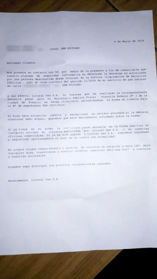 Ante esta situación muchos vecinos acudieron a las oficinas de Litoral Gas en calle España con la mencionada nota, donde el gerente les confirmó el hackeo a las facturación de la empresa.